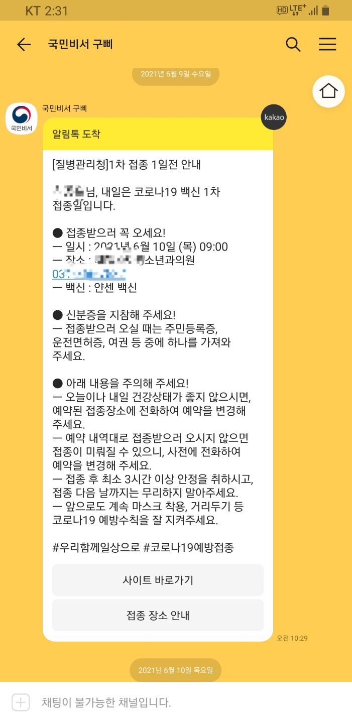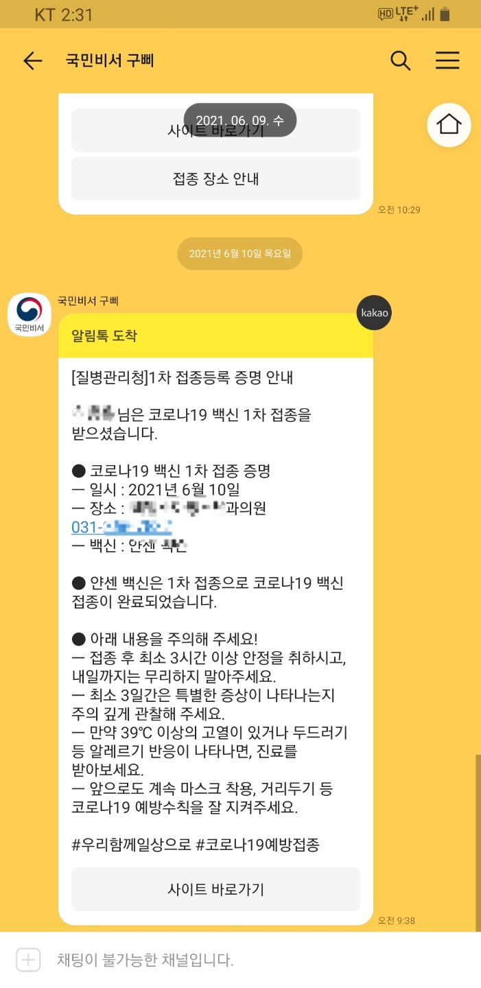 백신 맞은 직후에는 또 다시 카톡이 오네요.
